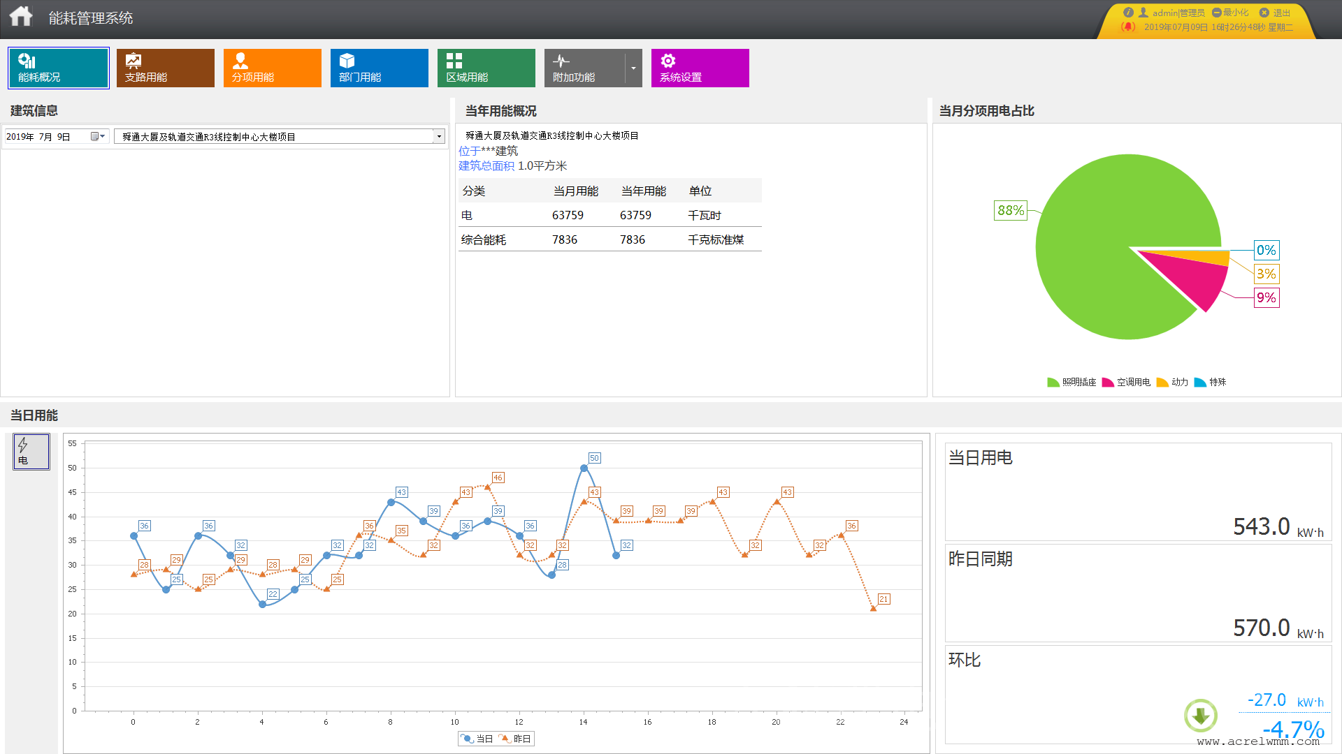 通过表计计量的主要为电能消耗,界面下方显示电能的当日逐时用能曲线;单击每个分类能耗的上部区域,可跳转到该分类能耗的用能分析主界面;