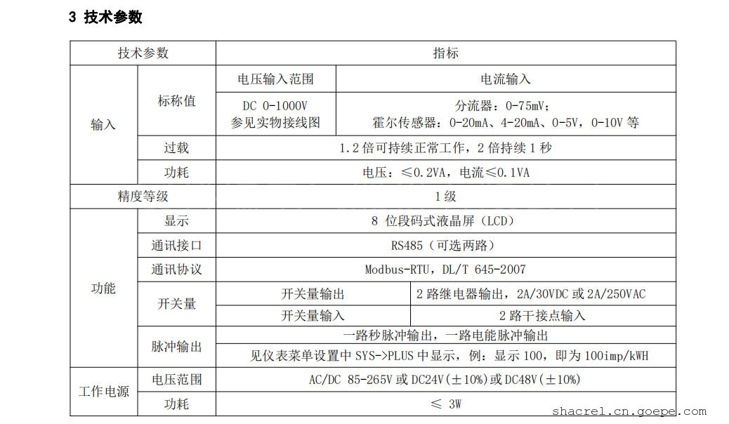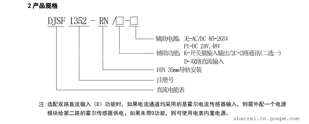 品牌:安科瑞 型号:DJSF1352-RN/D 加工定制:是 类型:电子式 基本电流:0-9999 A 准确度等级:0.5级 参比电压:220/380 V 电流倍率:5 显示方式:液晶显示 频率:50 Hz 最大电流:9999 A 装箱数:1 DJSF1352-RN导轨式直流电能表带有双路直流输入,主要针对电信基站、直流充电桩、太阳能光伏等应用场合而设计,该系列仪表可测量直流系统中的电压、电流、功率以及正反向电能等。在实际使用现场,即可计量总电能,又可计量规定时间段内的电能。检测的结果既可用于本地显示,又能与工控设备、计算机连接,组成测控系统。仪表可具有红外通讯接口和RS-485通讯接口,同时支持Modbus-RTU协议和DLT645-97(07)协议;可带继电器报警输出和开关量输入功能;根据不同要求,通过仪表面板按键,对变比、报警、通讯进行设置;具有开关量事件记录(Modbus协议)、编程和事件设置记录(645协议)、数据瞬时和定时冻结功 -